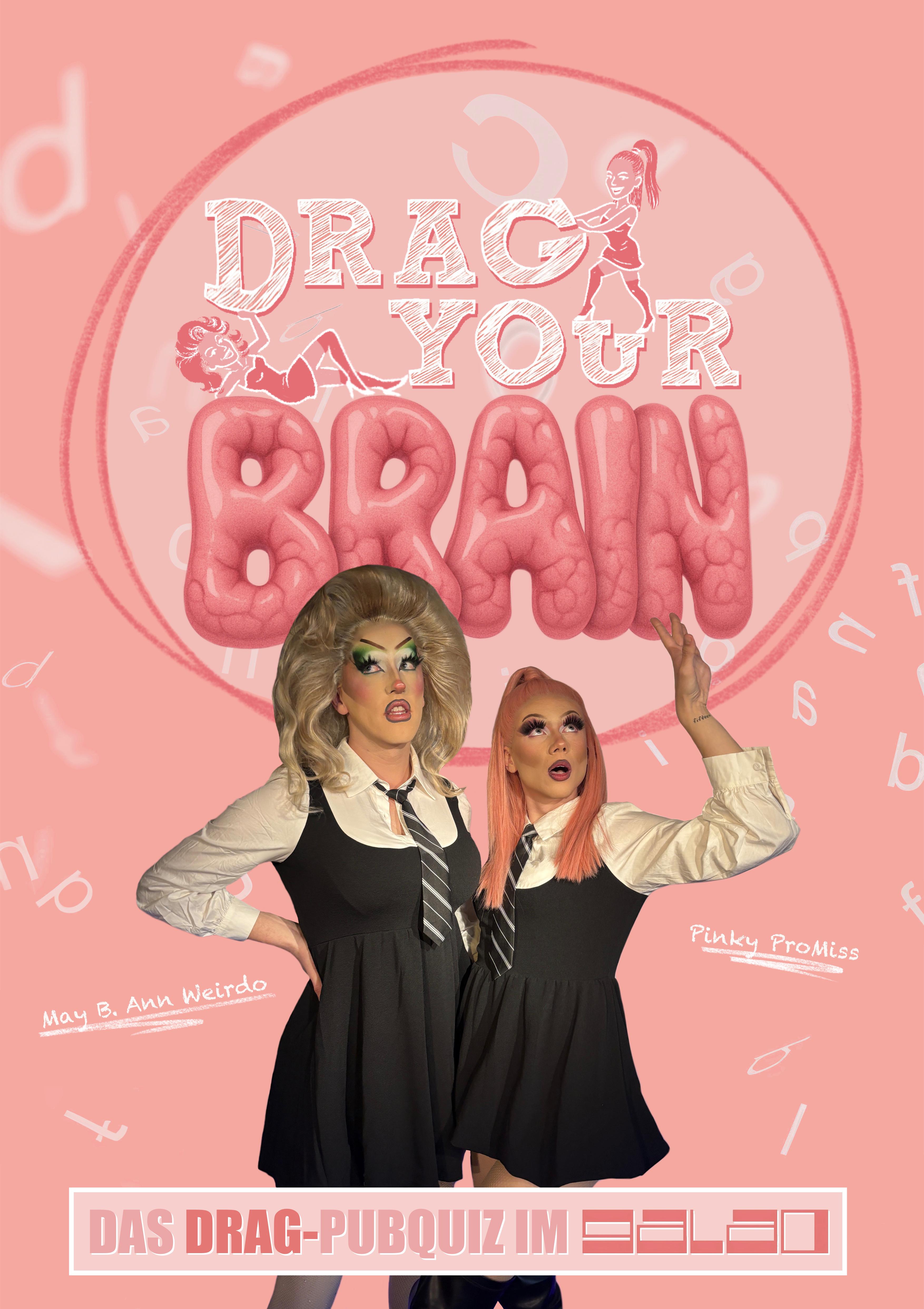 Es findet gleichzeitig ein Pubquiz und eine Dragshow statt und ihr seid traurig, weil ihr nicht zu beiden hingehen könnt? Then we got you! Denn ab sofort findet im Café Galao monatlich das neue, queere Drag-Pubquiz DRAG YOUR BRAIN mit uns, May B. Ann Weirdo und Pinky ProMiss statt. Ihr glaubt ihr seid smart? Dann kommt vorbei und stellt euch kniffligen Fragen und gewinnt dabei mit etwas Glück einen 50€-Wertgutschein für das Café Galao. Drag-Performances inklusive! Der Eintritt ist kostenlos, wir freuen uns dennoch über eine Spende! Don't miss this! We're waiting for you!